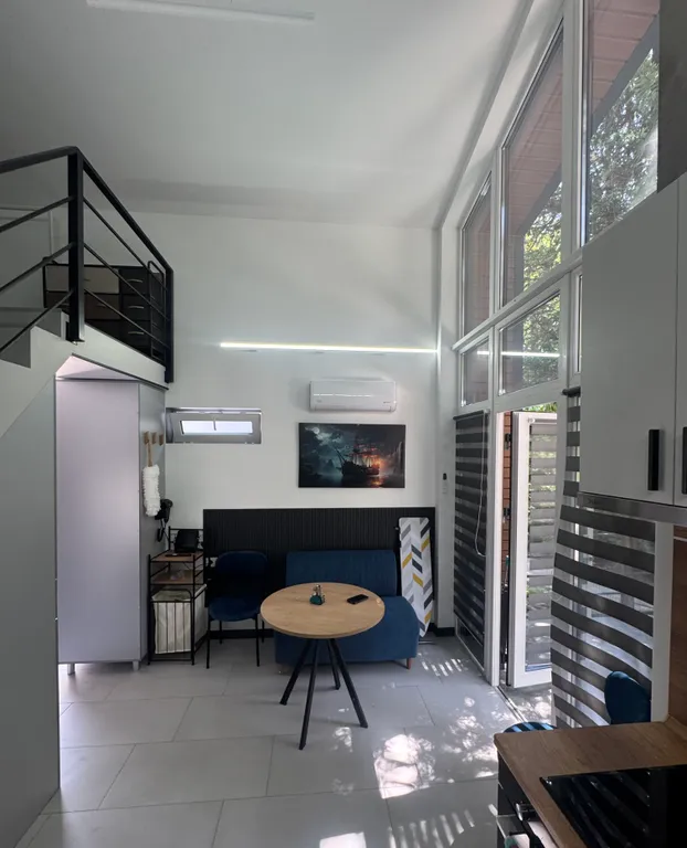 На первом этаже размещена кухня-гостиная и детская спальная комната с двумя кроватями (190 на 70). На втором этаже установлена двуспальная кровать (160 на 200). Выход из гостиной на большую летнюю террасу, где размещены диван и два кресла, а также барная стойка.