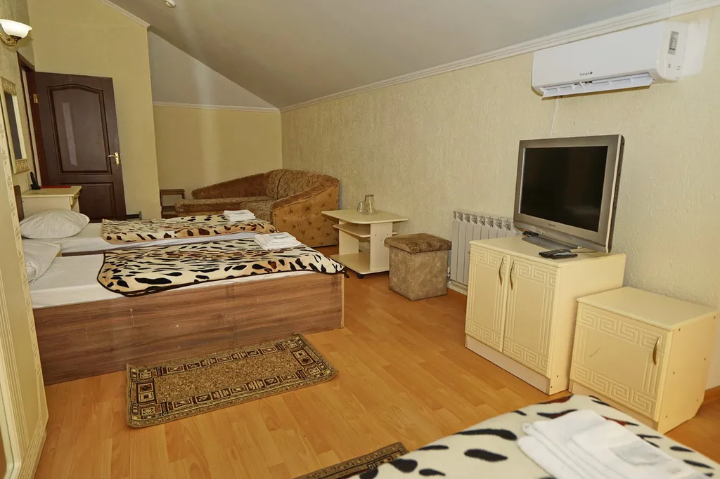 - две односпальные кровати, диван-кровать, телевизор, мини-холодильник, сплит-система, шкаф. Сан.узел. Отель расположен в Центральной части города Туапсе, на городском пляже, в непосредственной близости к морю. Стоимость дополнительного места в отеле - 900,00 рублей в сутки с одного человека.