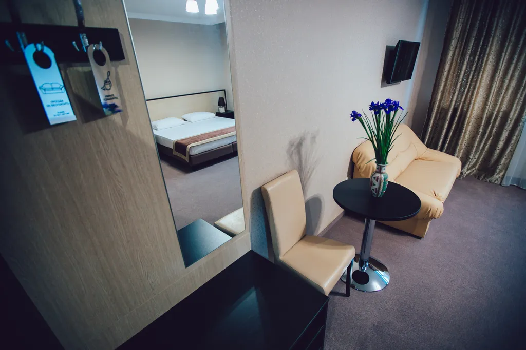 В каждом номере-стандарт есть прикроватные тумбочки, на которых стоят светильники с мягким светом, что позволяет Вам почитать книгу, не мешая отдыхать Вашему спутнику. Номер-стандарт, площадью 35 кв.м. В мини-баре в наличии прохладительные напитки, пиво, орешки (за отдельную оплату).