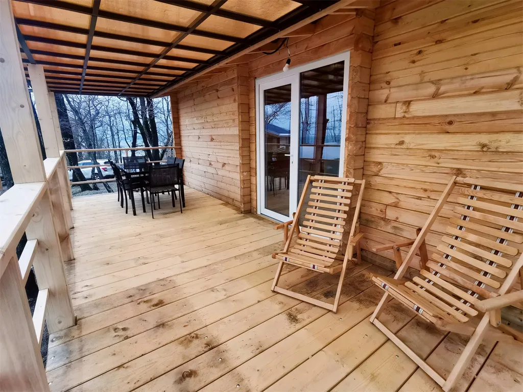 Дом с двумя спальнями, панорамными окнами, боковым видом на море, большой террасой и кухней.
