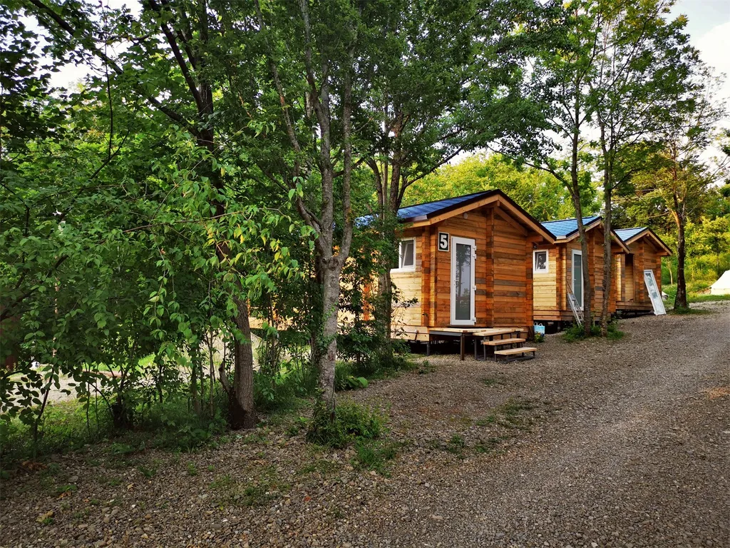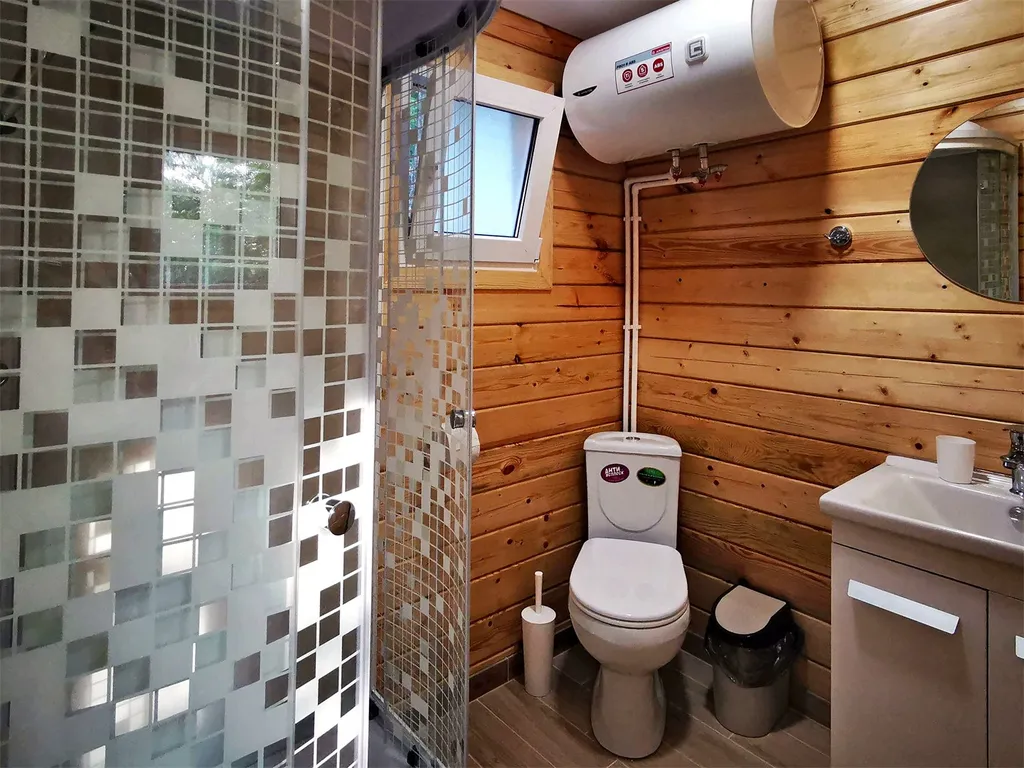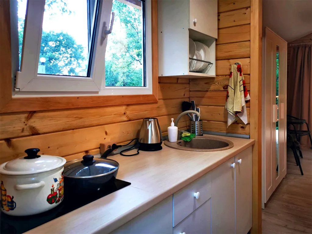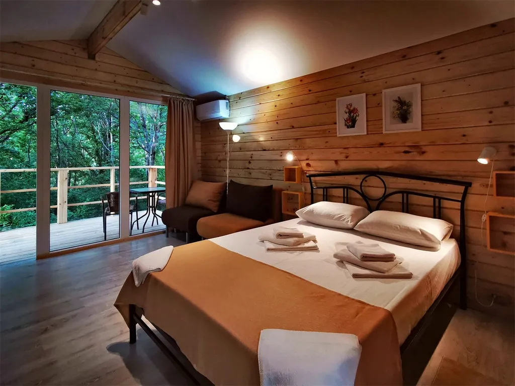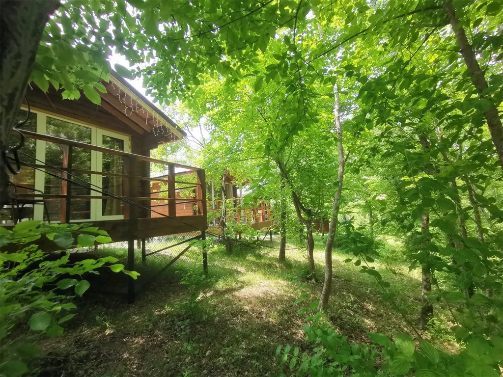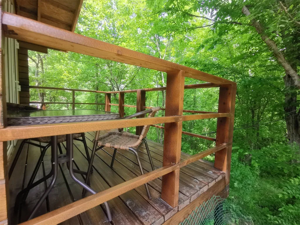 Отдельный домик с видом на лес, санузлом, террасой и мини-кухней.